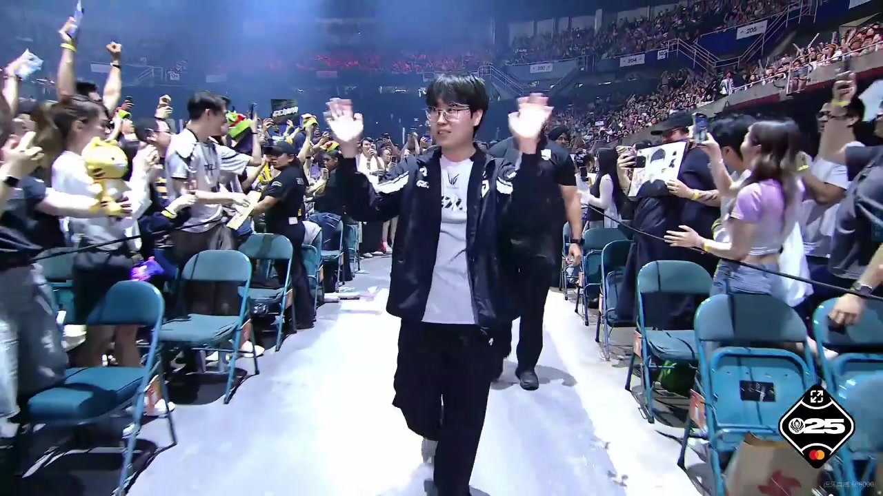 T1vsGEN两队选手入场:Doran指了指T1队标,Faker登场全场欢呼!