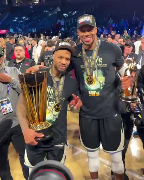 >利拉德和字母哥手捧奖杯合影 利指导看着还有些腼腆👻