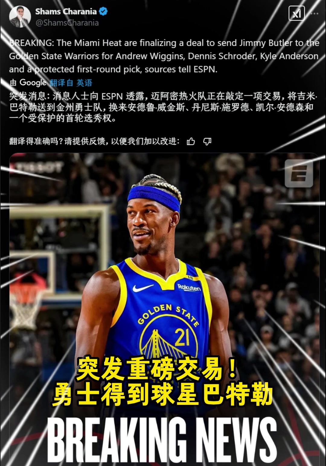 💥重磅!勇士交易得到巴特勒!送出维金斯李凯尔施罗德+1首轮