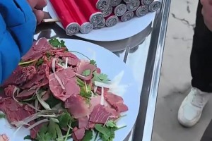 女子跟朋友来吃李庄白肉,没想到这肉还是卷到筷子上吃