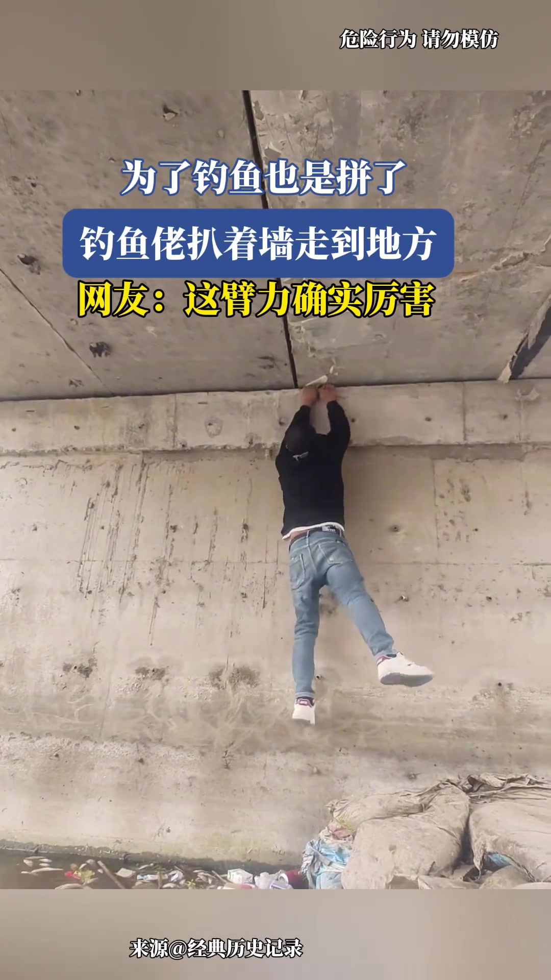 为了钓鱼也是拼了,钓鱼佬扒着墙走到钓点!