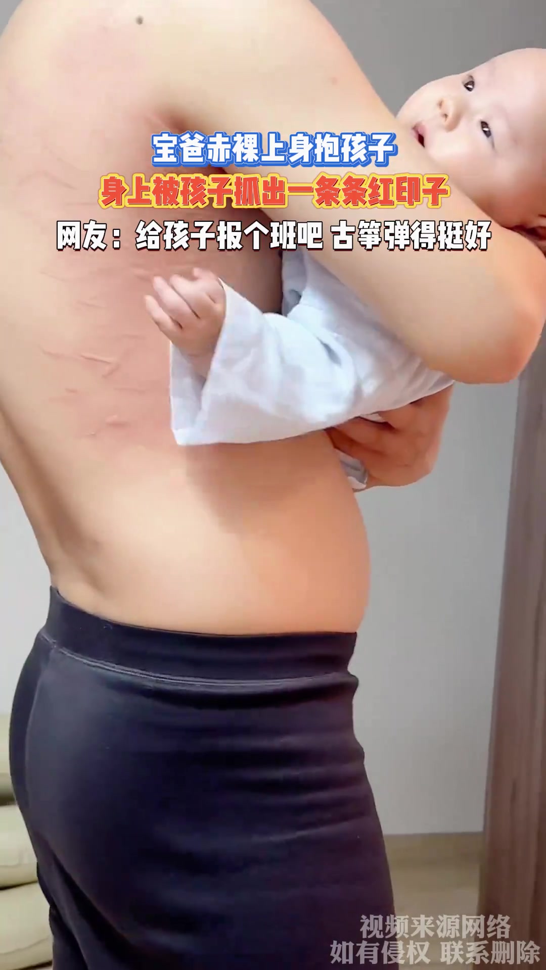 宝爸赤裸上身抱孩子,身上被孩子抓出一条条红印子