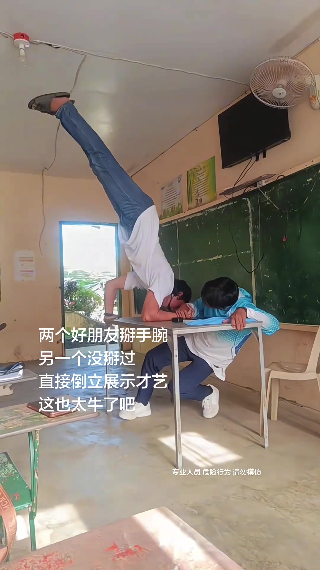 两个好朋友掰手腕 另一个没掰过 直接倒立展示才艺