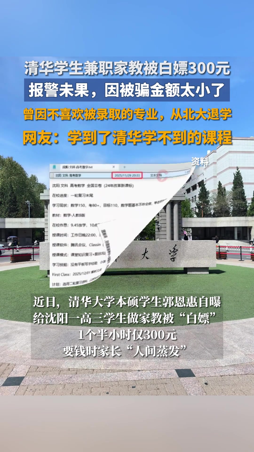 清华学生兼职家教被白嫖300元,报警未果,因被骗金额太小了