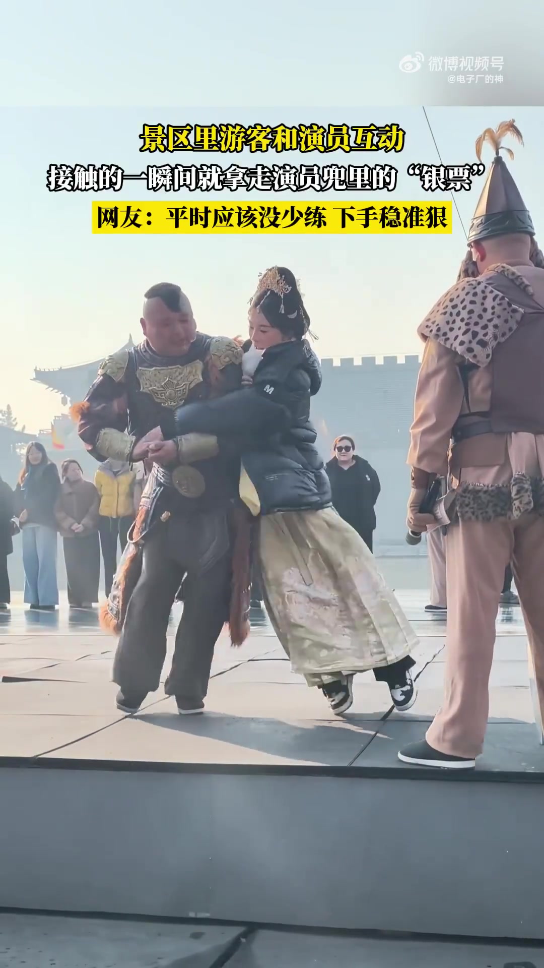 景区里游客和演员互动,接触的一瞬间就拿走演员手里的“银票”!