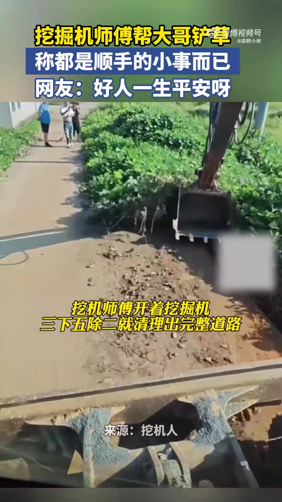 >挖掘机师傅帮大哥铲草,称是顺手小事