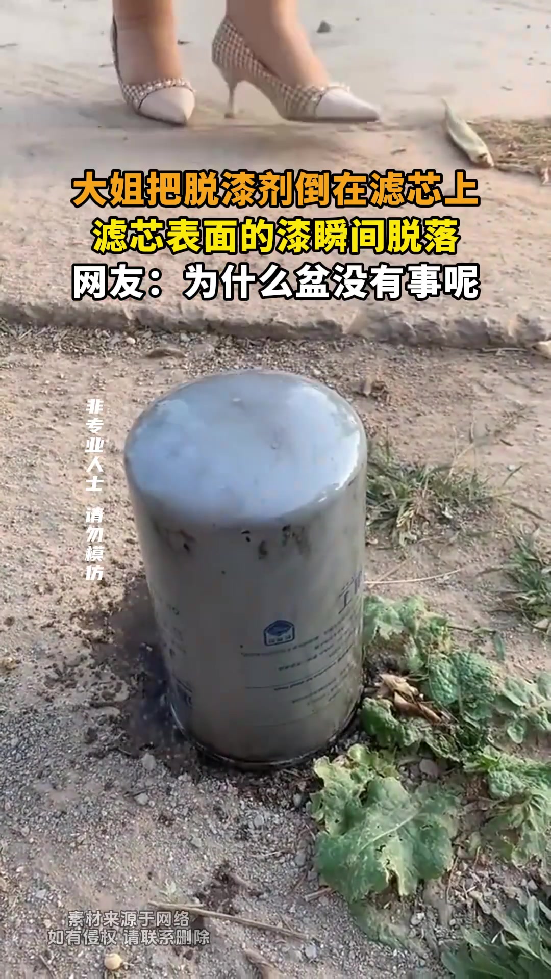 >大姐把脱漆剂倒在滤芯上,滤芯表面的漆瞬间脱落!盆咋没有事呢