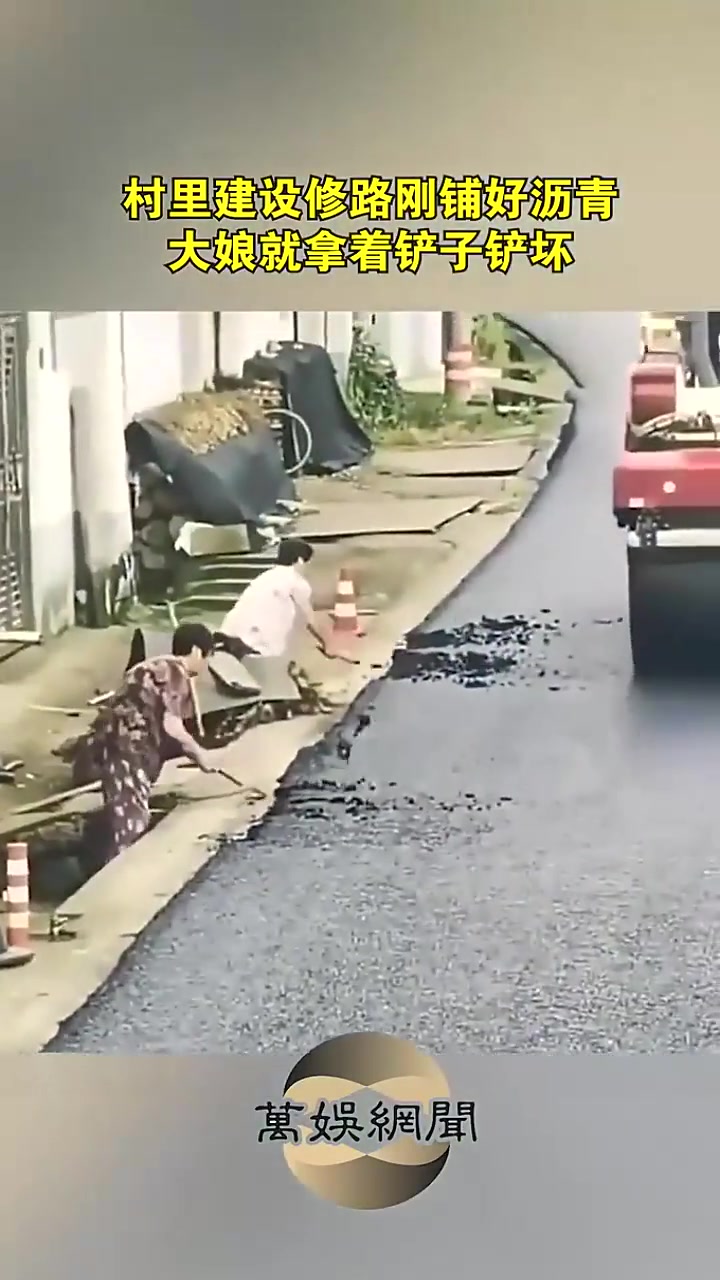 村里建设修路刚铺好沥靑,大娘就拿着铲子铲坏 !