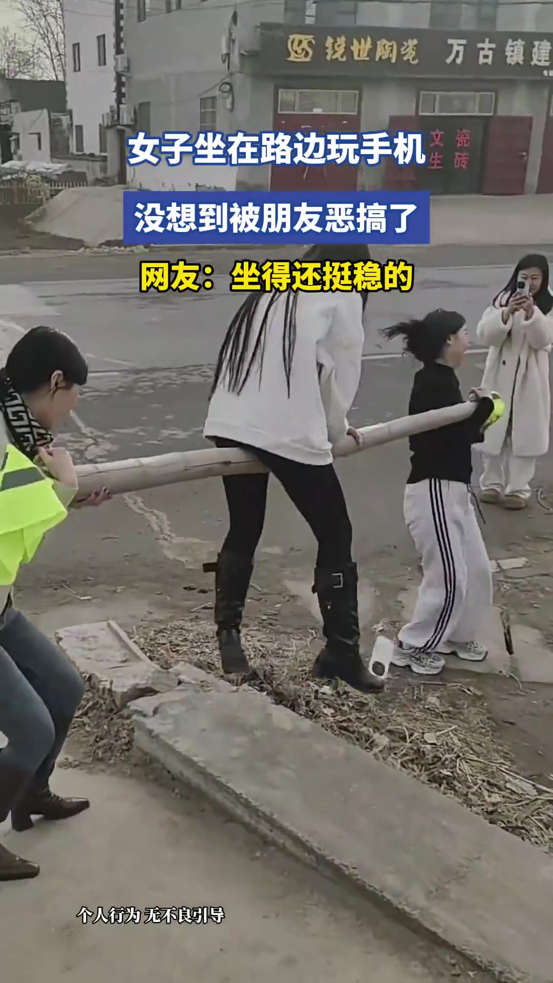 女子坐在路边玩手机,没想到被朋友恶搞了,网友:坐得还挺稳的