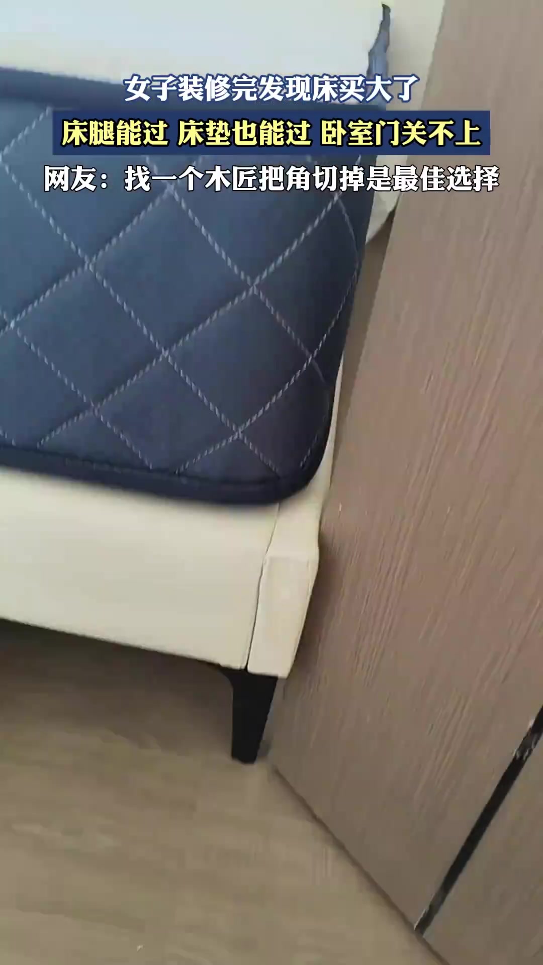 >女子装修完发现床买大了,床腿能过,床垫也能过,卧室门关不上
