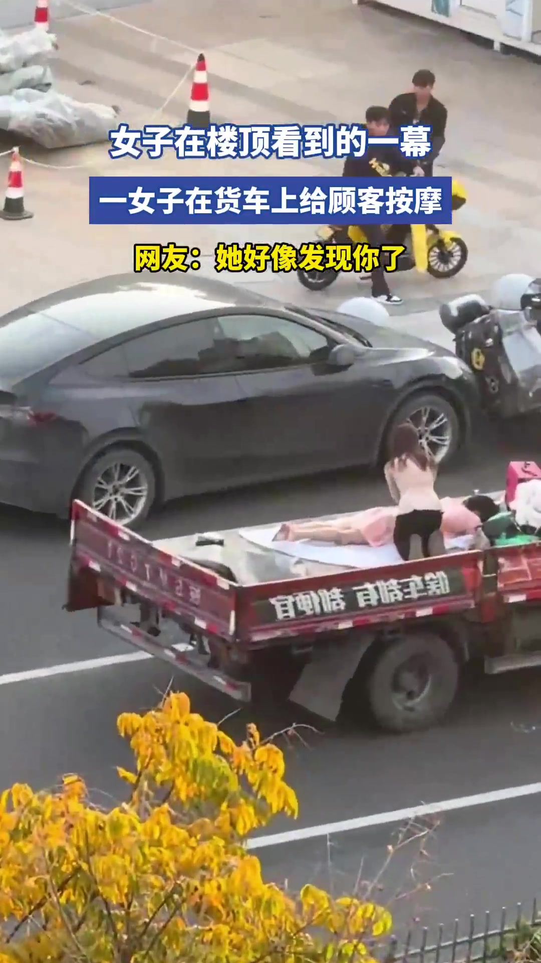 >女子在楼顶看到的一幕,一女子在货车上给顾客按摩