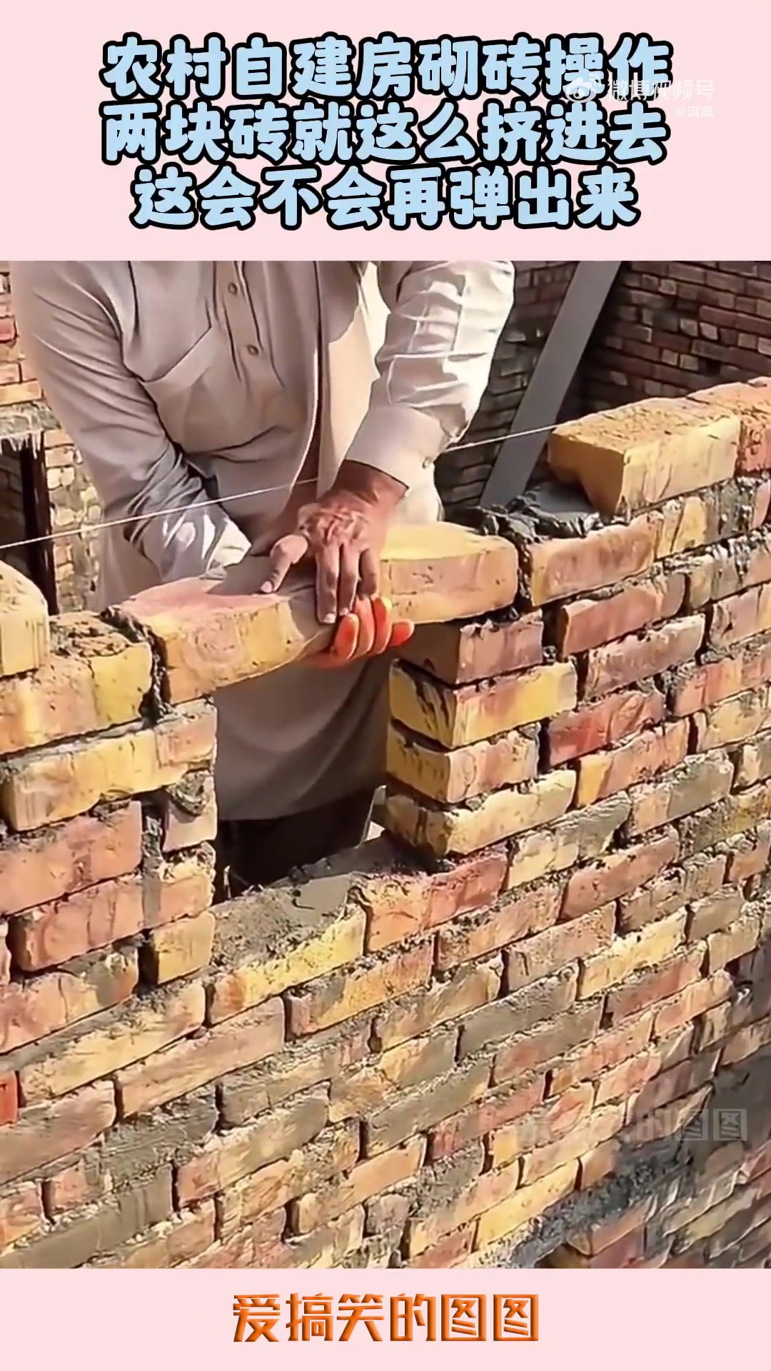 >农村自建房砌砖操作,两块砖就这么挤进去,这会不会再弹出来!