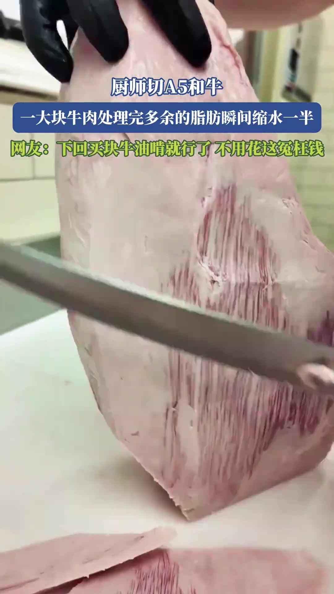 >厨师切A5和牛,一大块牛肉处理完多余的脂肪瞬间缩水一半