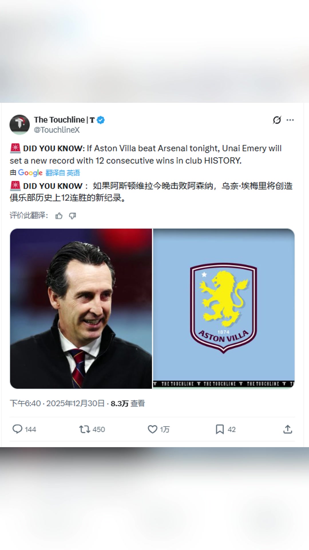 如果维拉今天击败阿森纳,埃梅里将创造俱乐部史上12连胜的新纪录