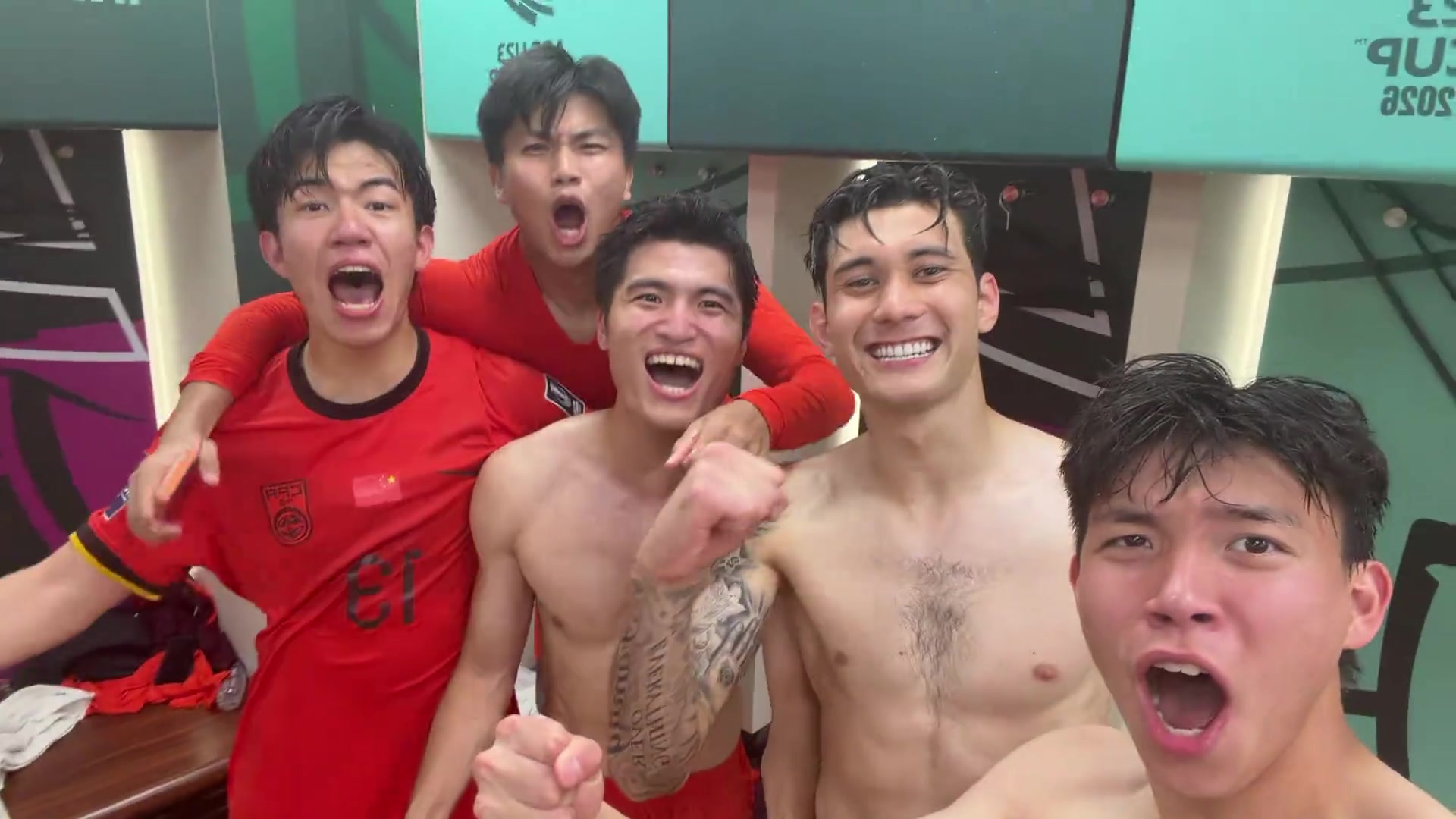 阳光大男孩们!王钰栋和队友更衣室光膀子呐喊庆祝晋级