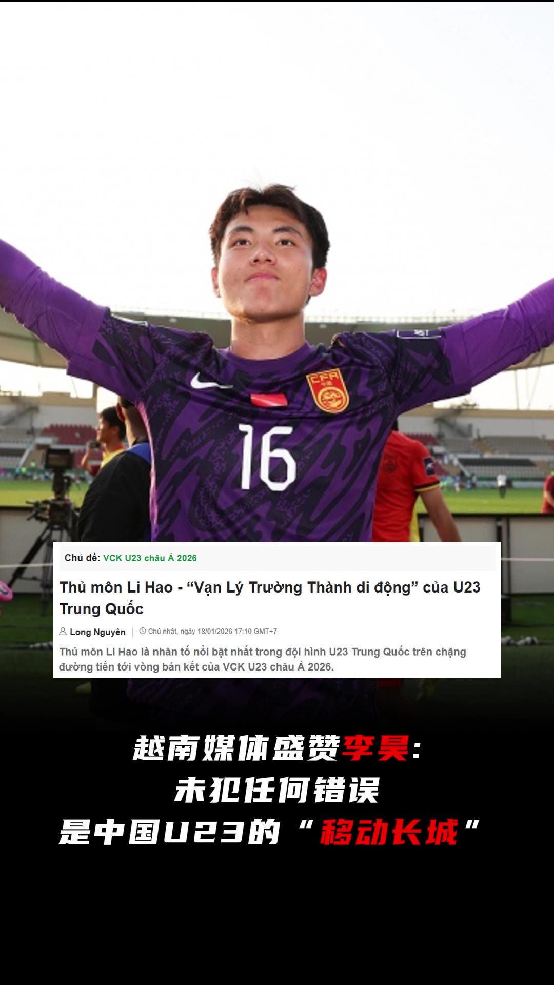 >越媒盛赞李昊:中国U23的“移动长城”,队中最杰出的球员