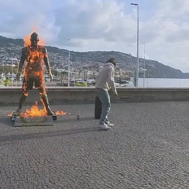 >胆子这么大!男子放火烧马德拉岛上的C罗雕像
