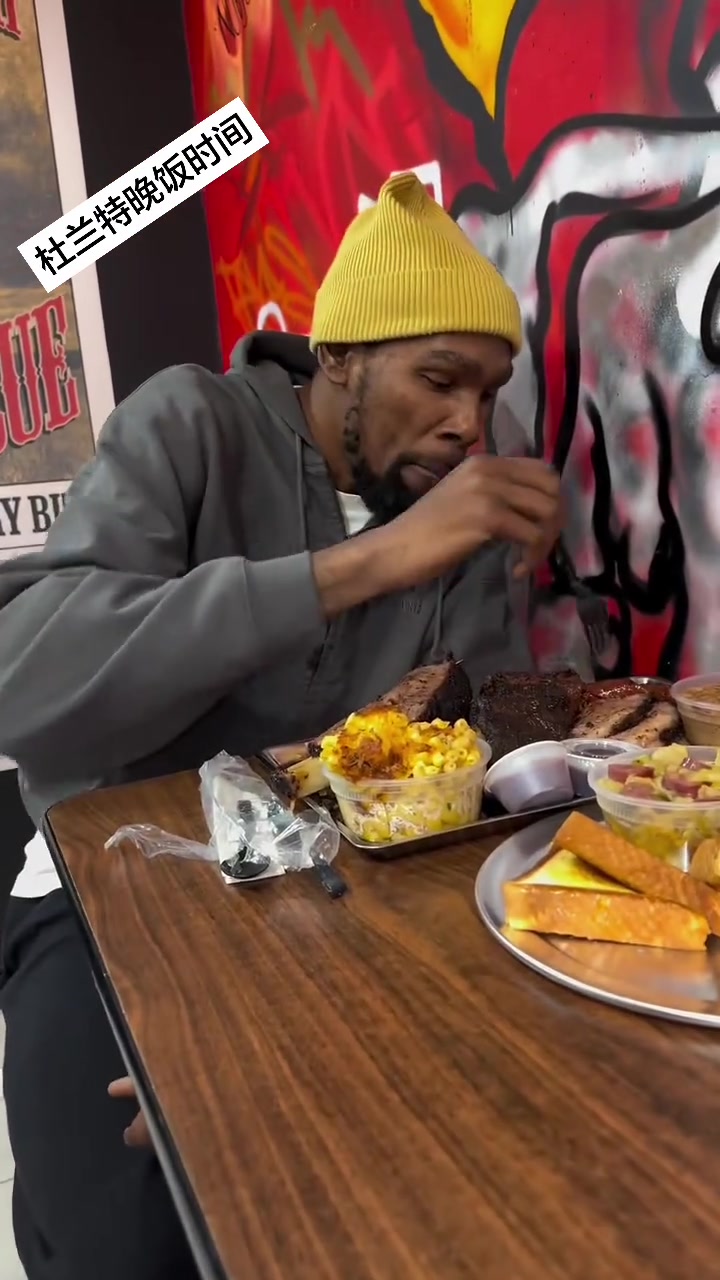 >看着瘦瘦的但饭量真大!杜兰特比赛结束后享受美食