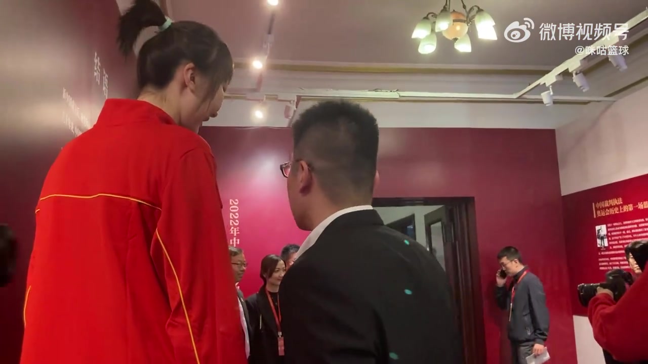 韩旭受邀参加中国篮球名人堂入堂仪式 与工作人员合影时高出好多