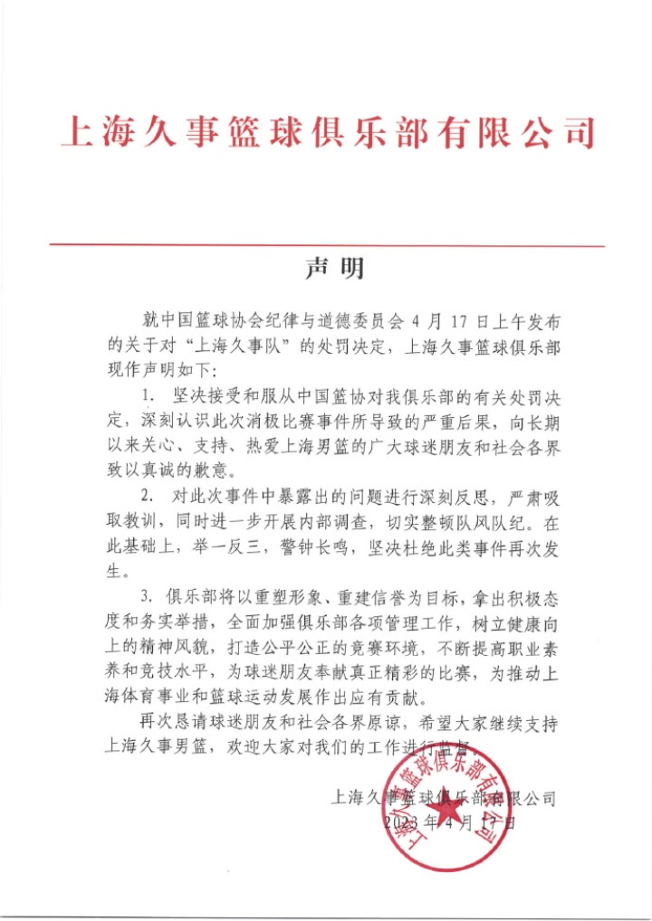 上海男篮回应篮协处罚:坚决服从处罚 会深刻反思重塑形象