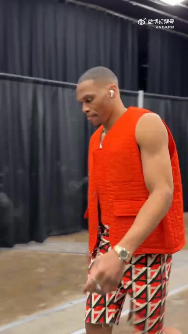 >威少早早抵达球馆热身,这身装扮骚的很啊!