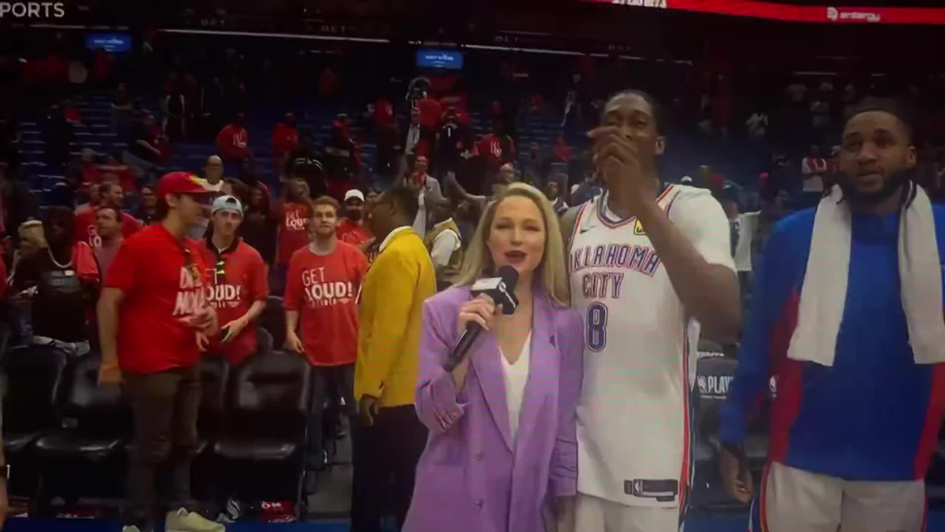 >😂杰伦赛后正要接受TNT女记者采访,结果被雷霆队友们拉去一起先接受OKC媒体的采访