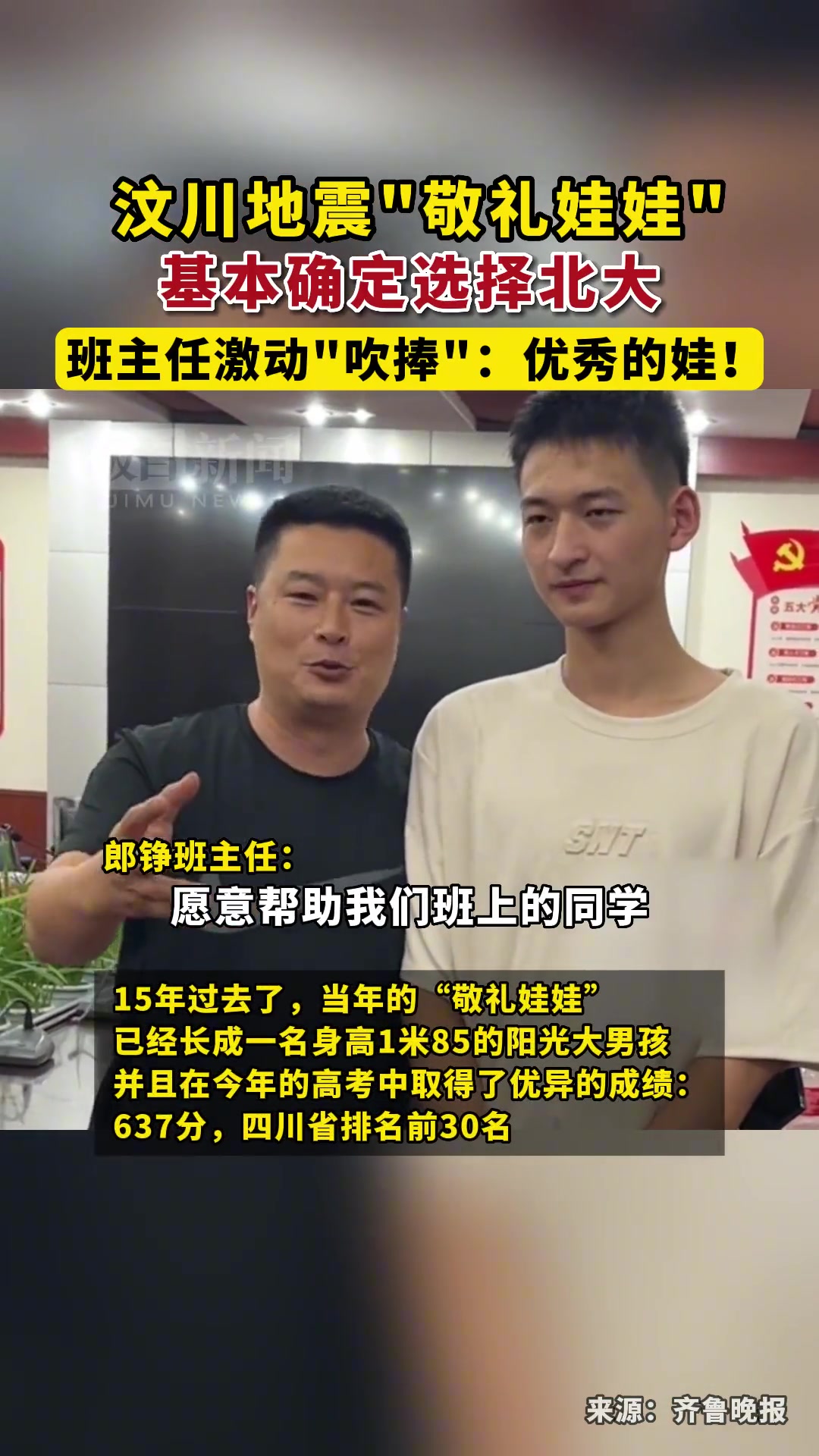 汶川地震“敬礼娃娃”基本确定选北大!班主任激动吹捧:优秀的娃
