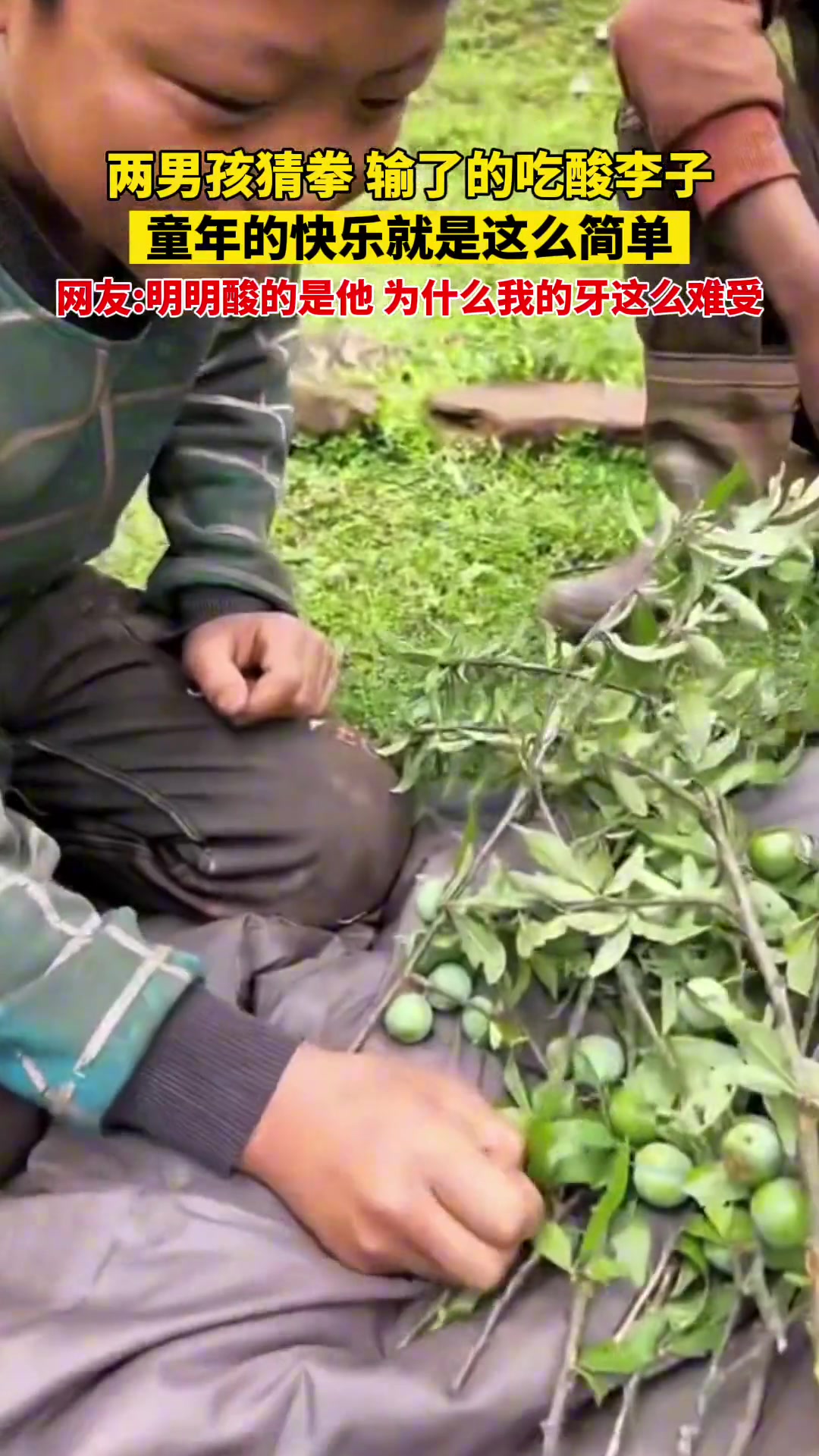 男孩猜拳输了的吃酸李子 童年的快乐就是这么简单