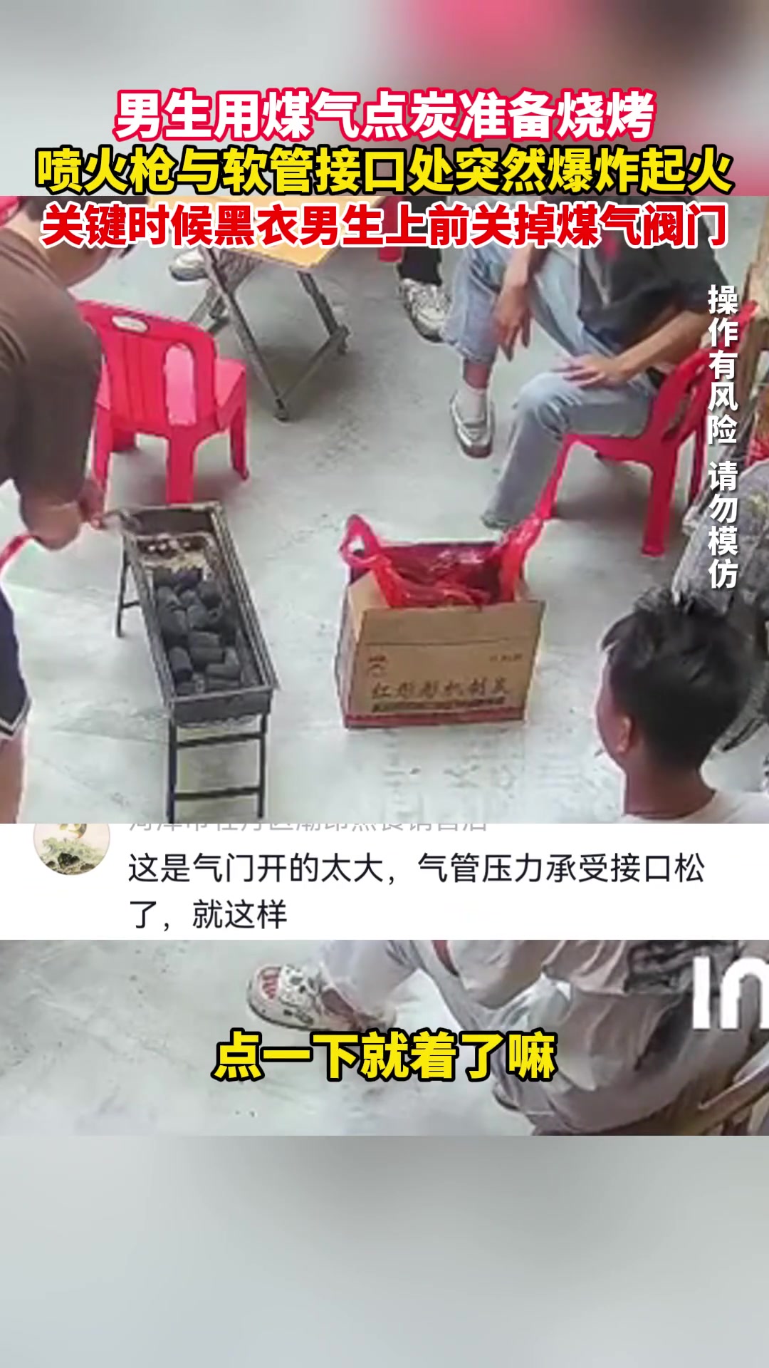 男生用煤气点炭准备烧烤,喷火枪与软管接口处突然起火