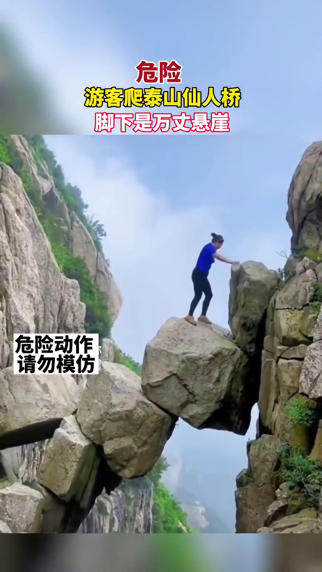 >危险!游客爬泰山仙人桥 脚下是万丈悬崖😱😱