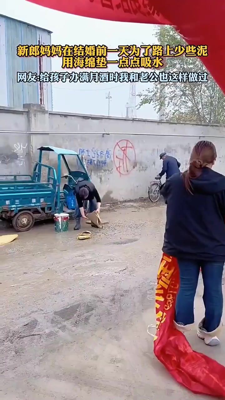 新郎妈妈在结婚前一天为了路上少些泥,用海绵垫一点点吸水🤔
