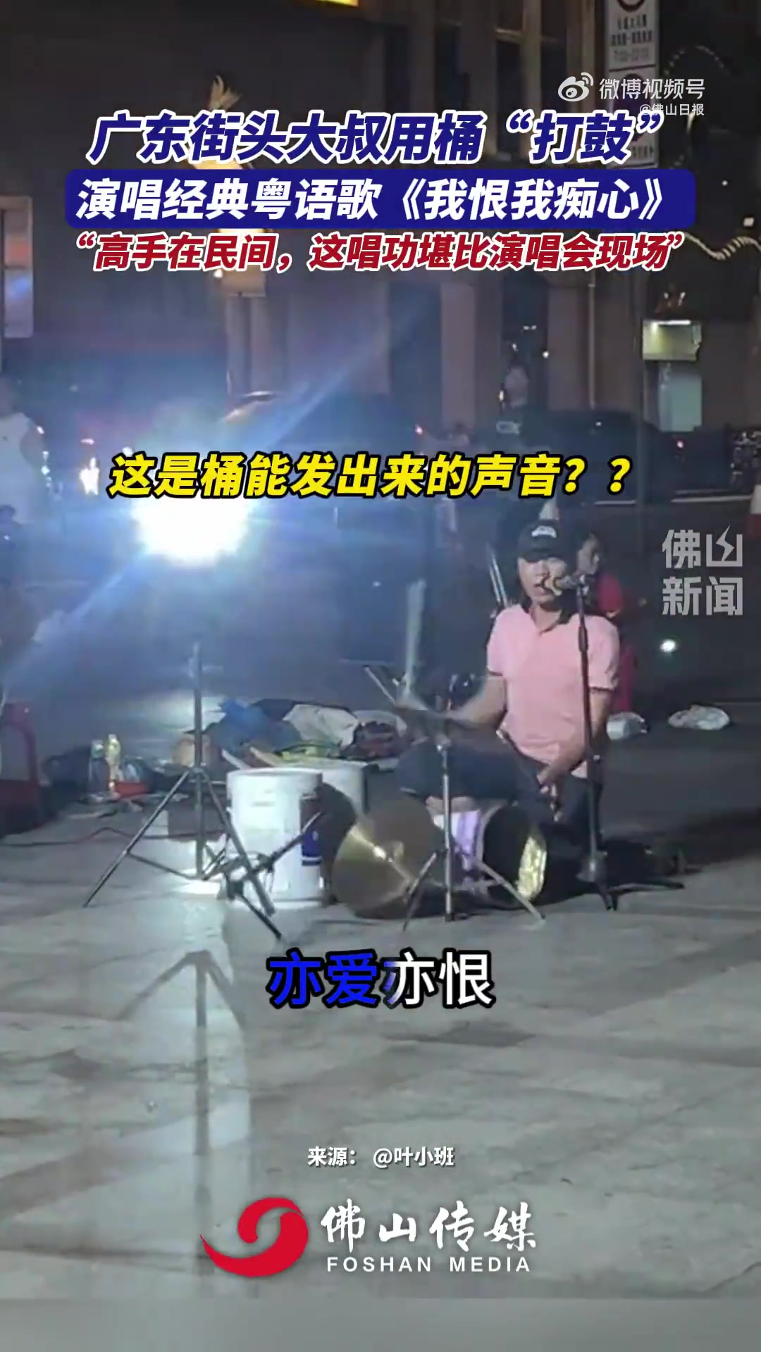 >广东街头大叔用桶打鼓唱粤语歌《我恨我痴心》,唱功堪比演唱会。