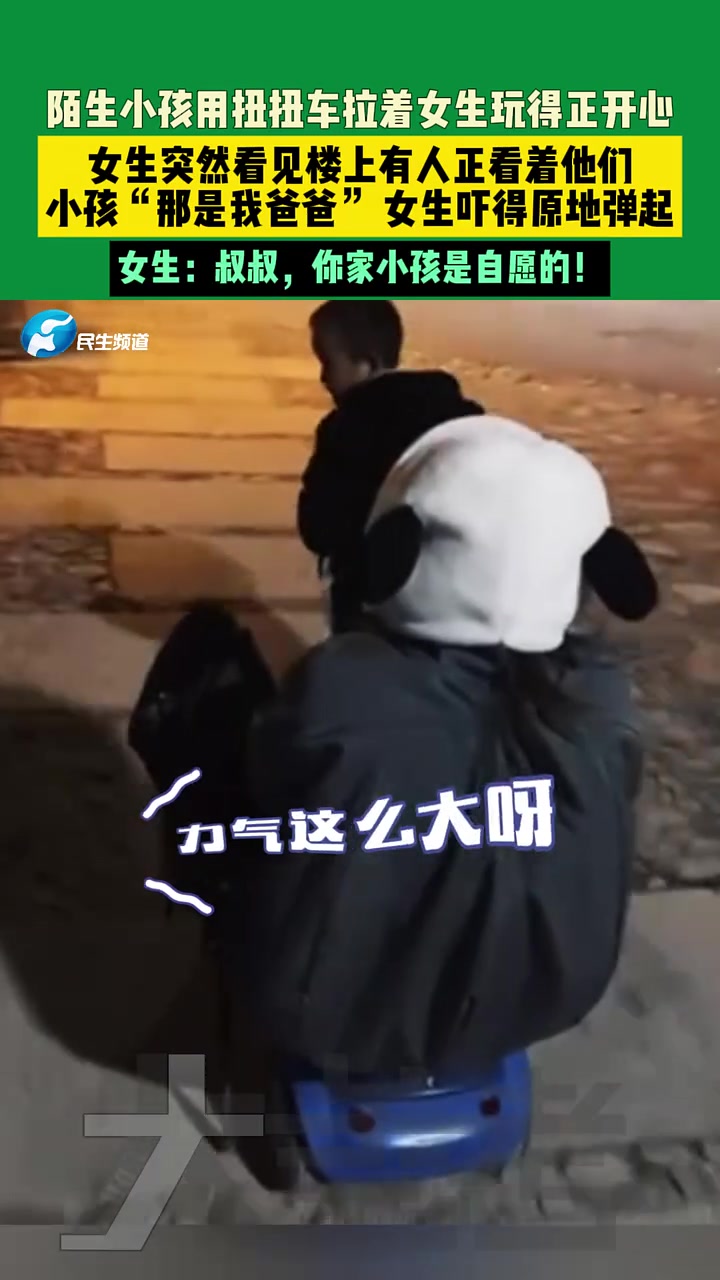 小孩用扭扭车拉着女生玩得正开心,突然看见楼上有人正看着他们