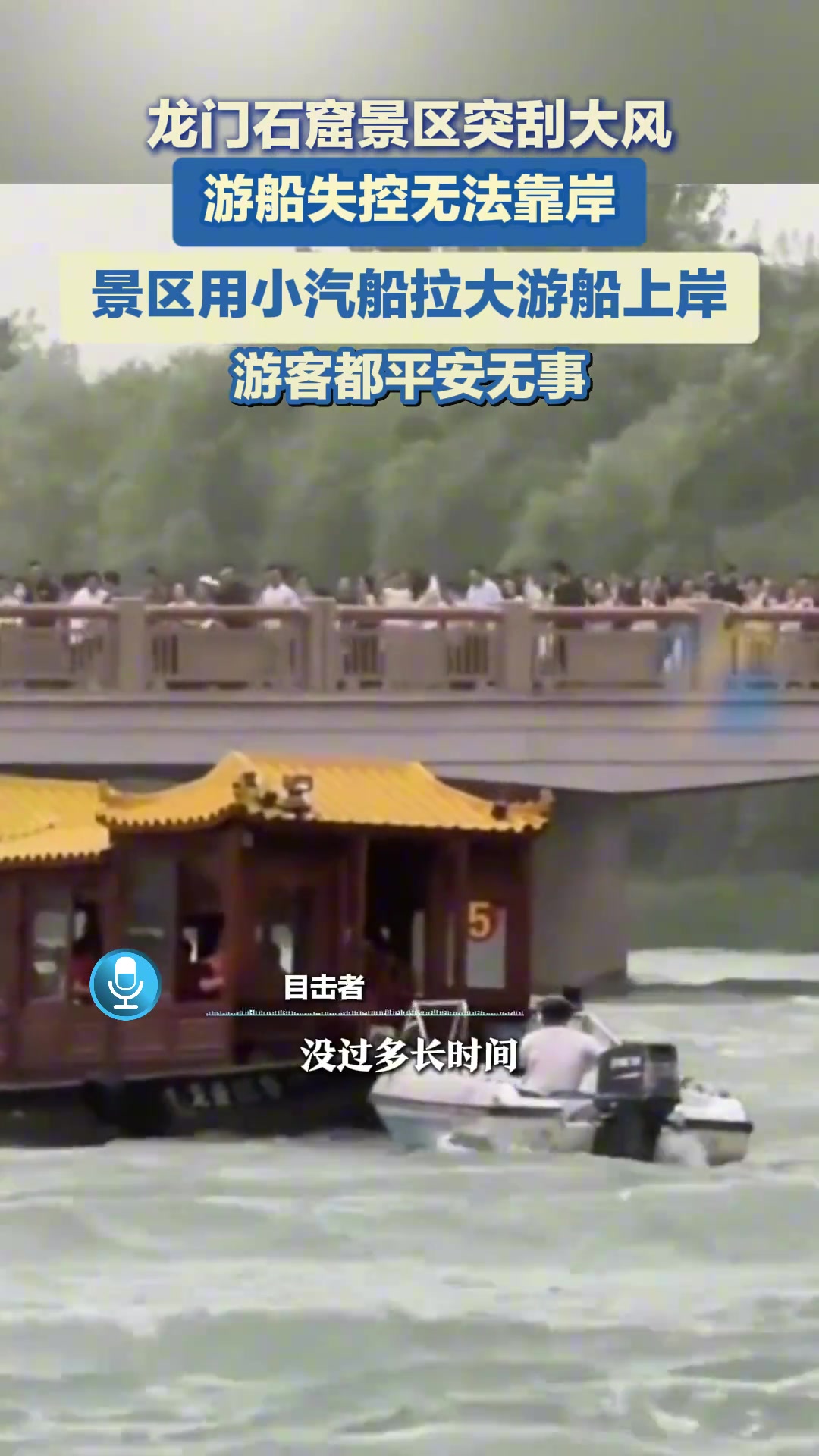 >龙门石窟景区突刮大风,游船失控无法靠岸