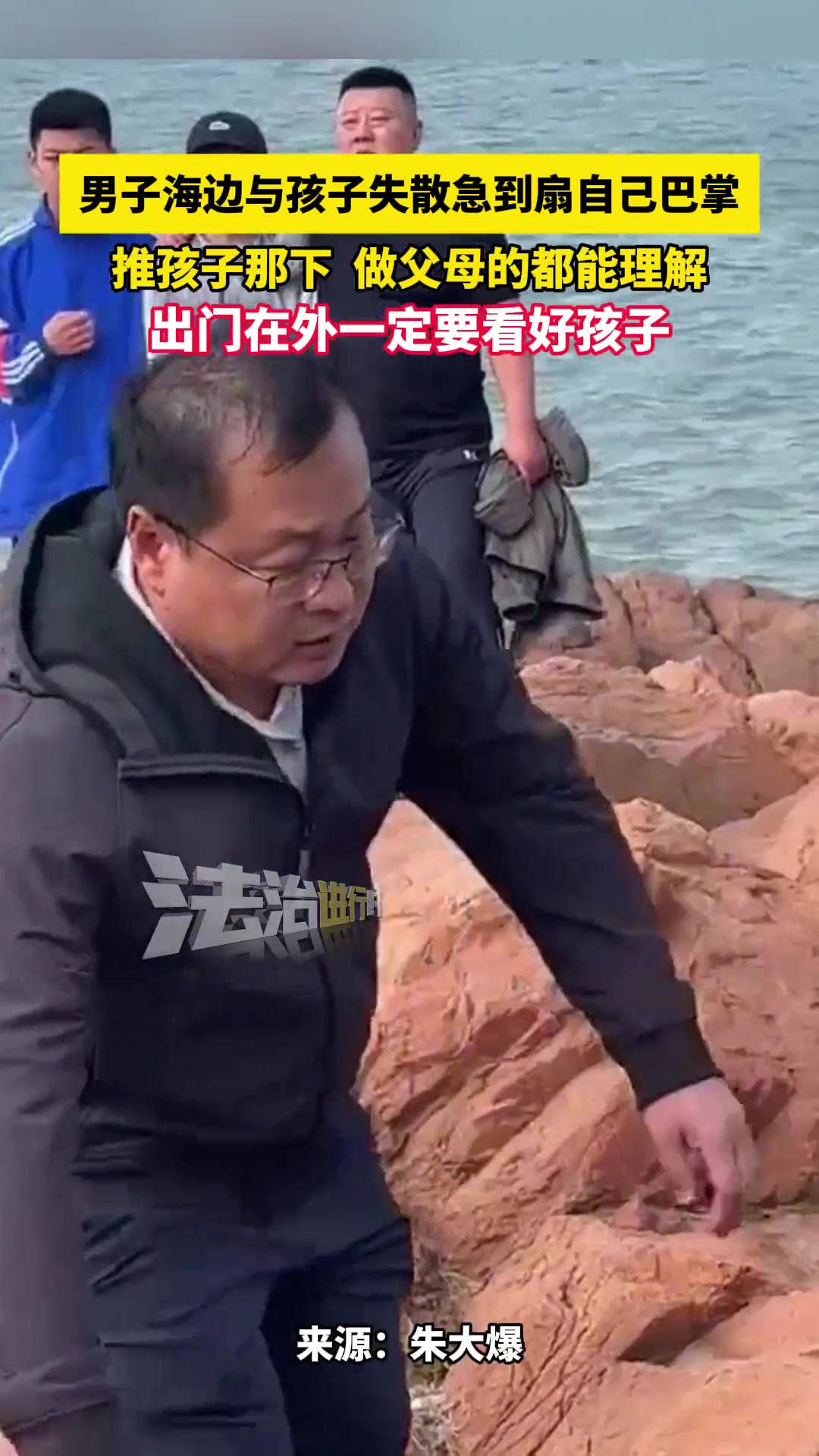 男子海边与孩子失散急到扇自己巴掌,推孩子那下,做父母的都能理解