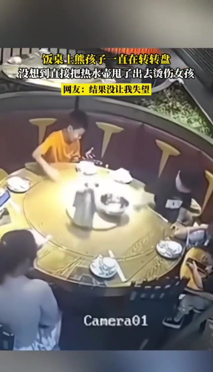 熊孩子一直旋转转盘,热水壶飞出烫伤女孩!!!