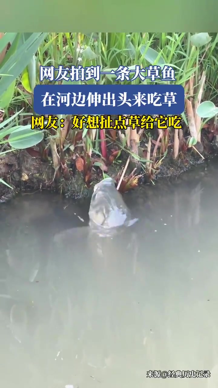 网友拍到一条大草鱼,在河边伸出头来吃草!