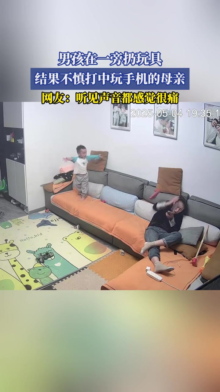 男孩在一旁扔玩具,结果不慎打中玩手机的母亲!!!