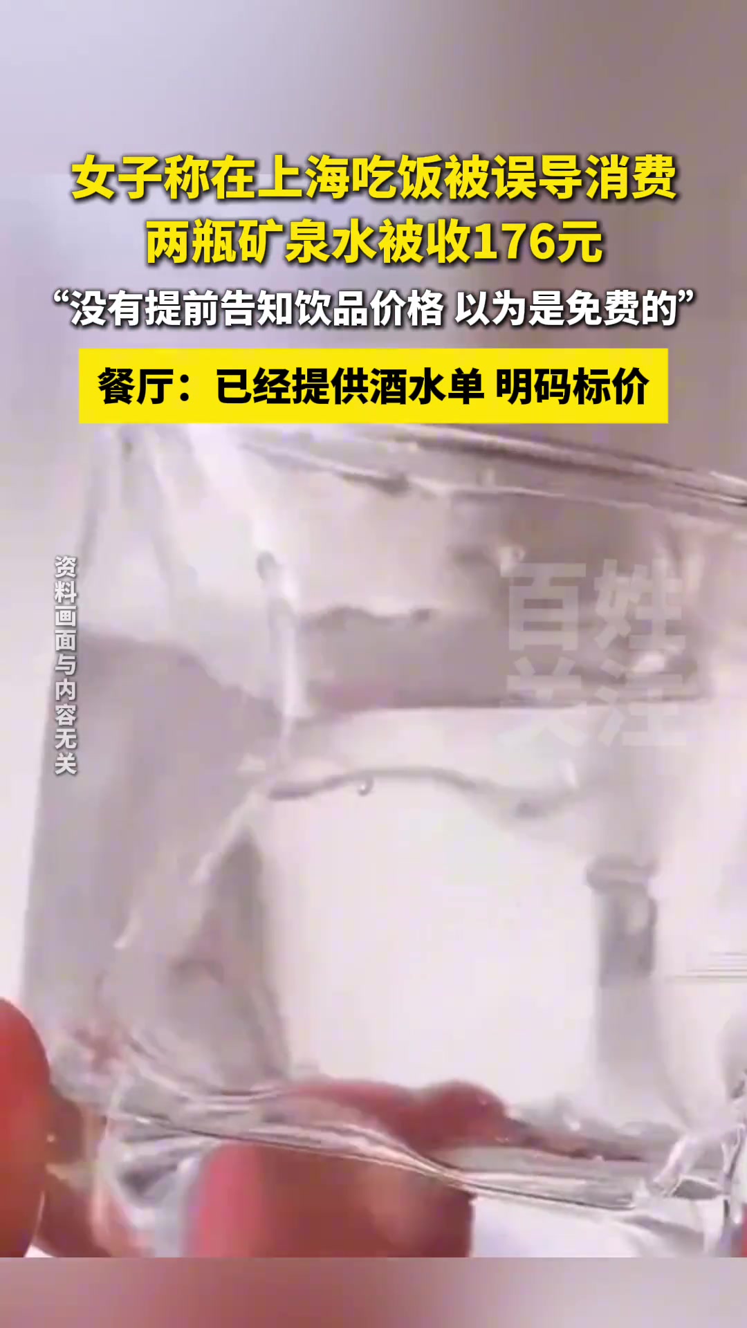 女子称在上海吃饭被误导消费,两瓶矿泉水被收176元。