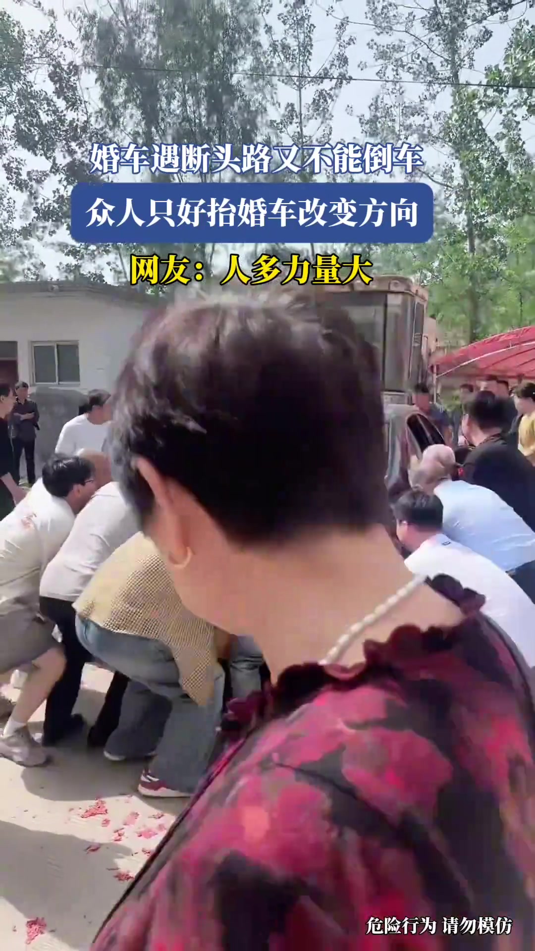 >婚车遇断头路又不能倒车,众人只好抬婚车改变方向