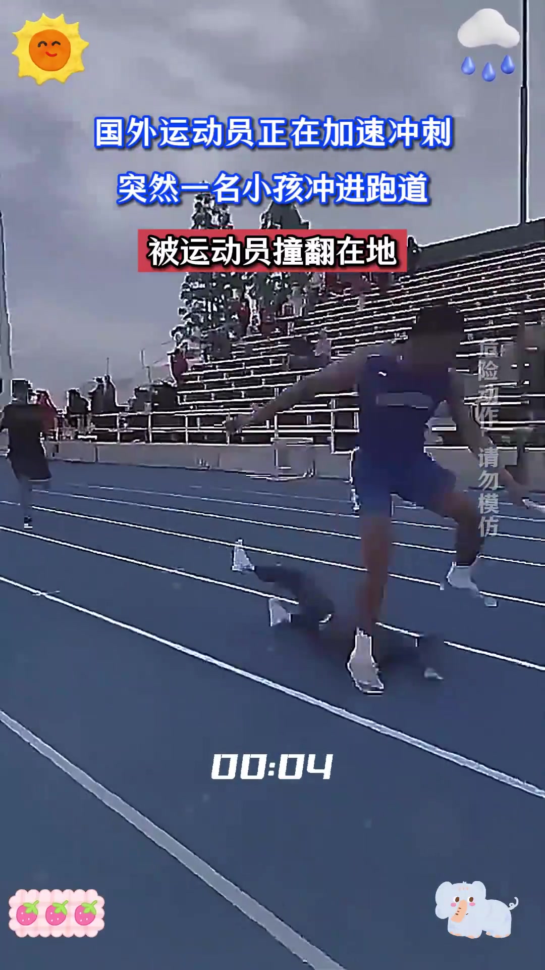 >国外运动员正在加速冲刺,突然一名小孩冲进跑道,被运动员撞翻