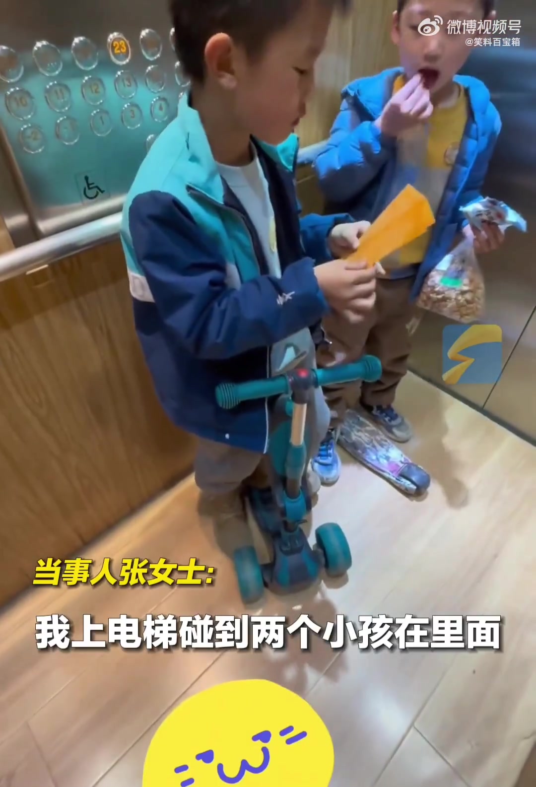 小姐姐电梯偶遇吃辣条小孩哥,馋得伸手超有趣