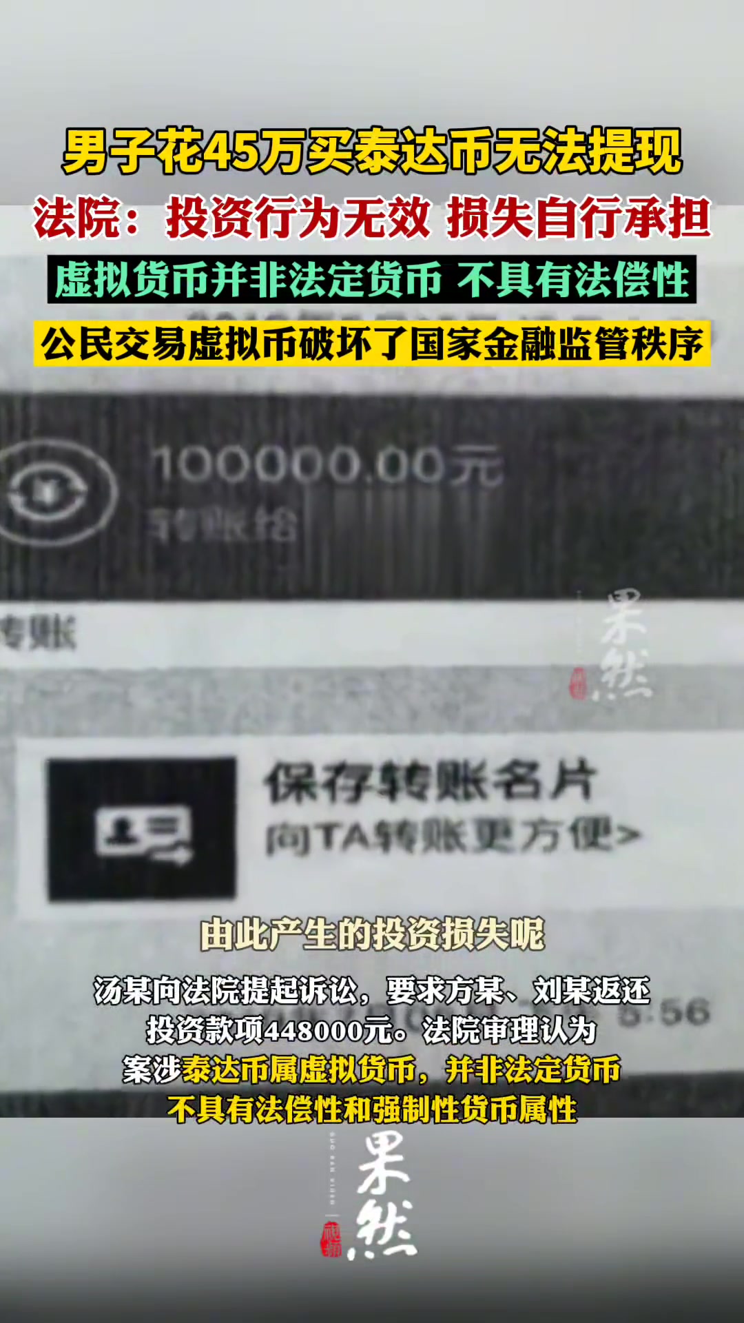>花45万买泰达币无法提现被判自担损失