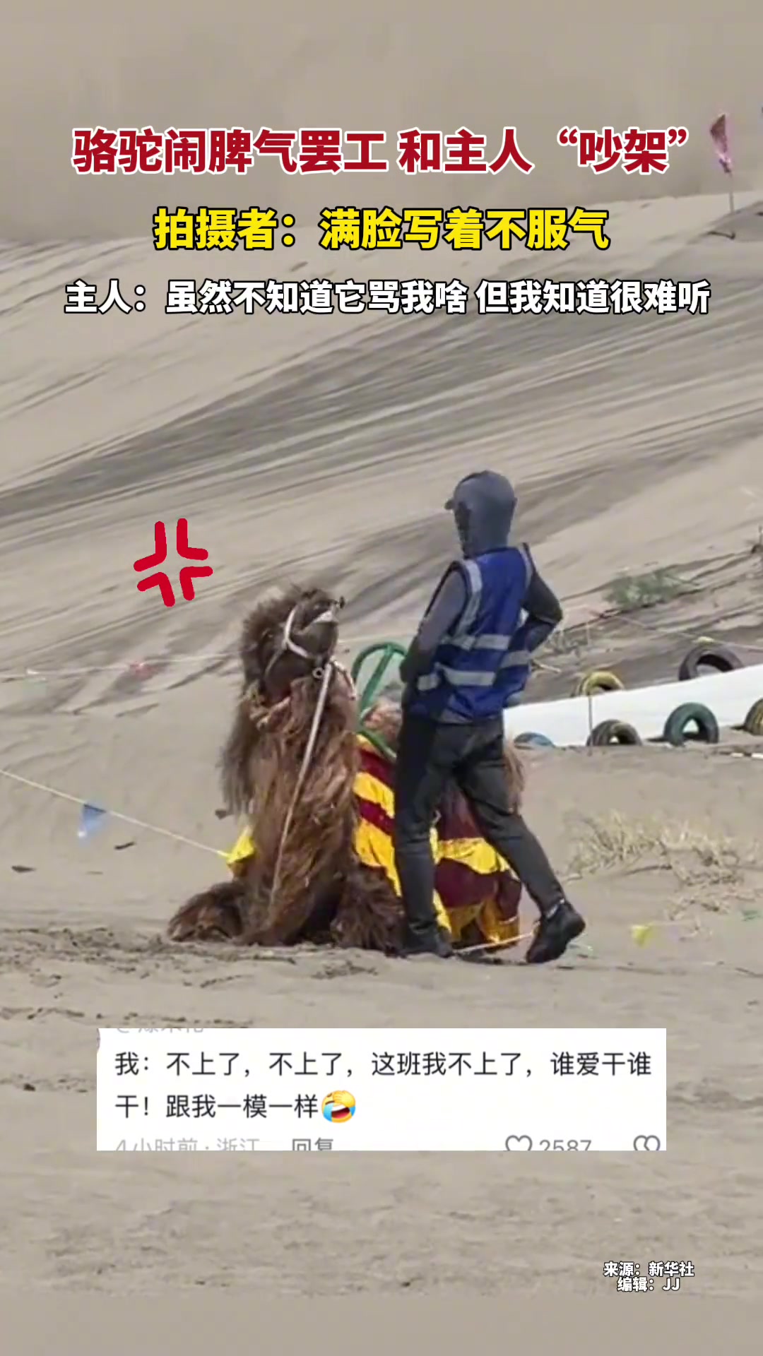>骆驼闹脾气罢工和主人“吵架” , 满脸写着不服气