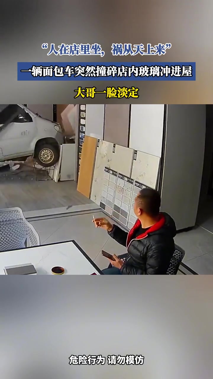 人在店里坐,祸从天上来,一辆面包车突然撞碎店内玻璃冲进屋!