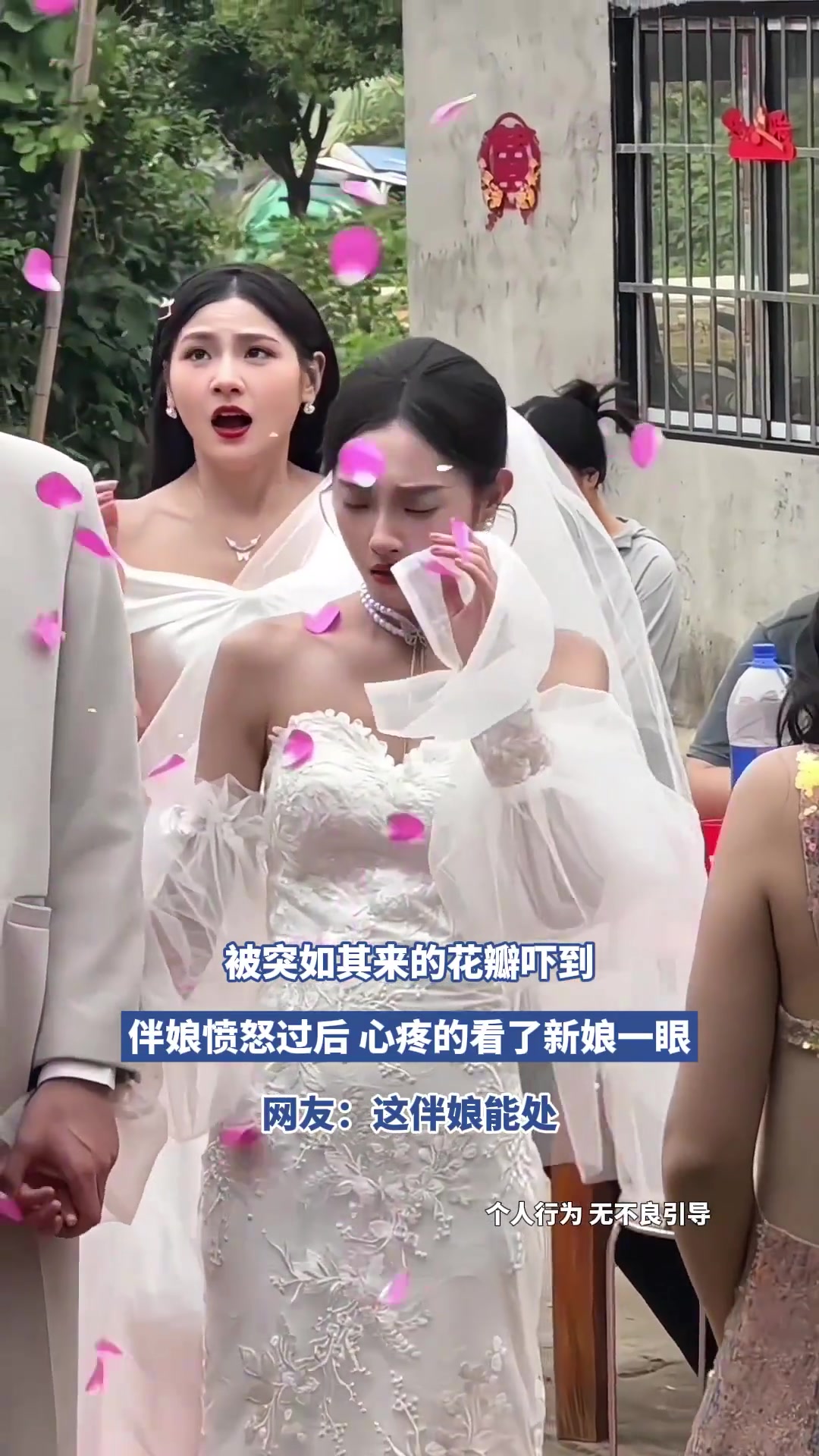 >伴娘被突如其来的花瓣吓到,愤怒后心疼看向新娘