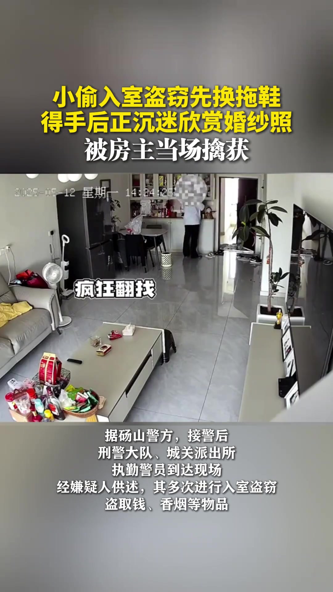小偷入室盗窃先换拖鞋,得手后正沉迷欣赏婚纱照,被房主当场擒获