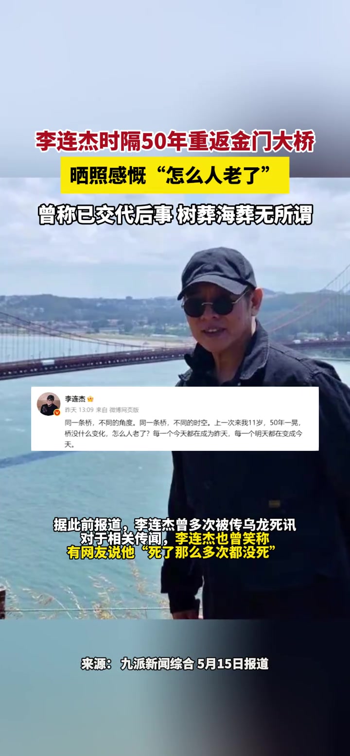 >李连杰时隔50年重返金门大桥,晒照感慨“怎么人老了”