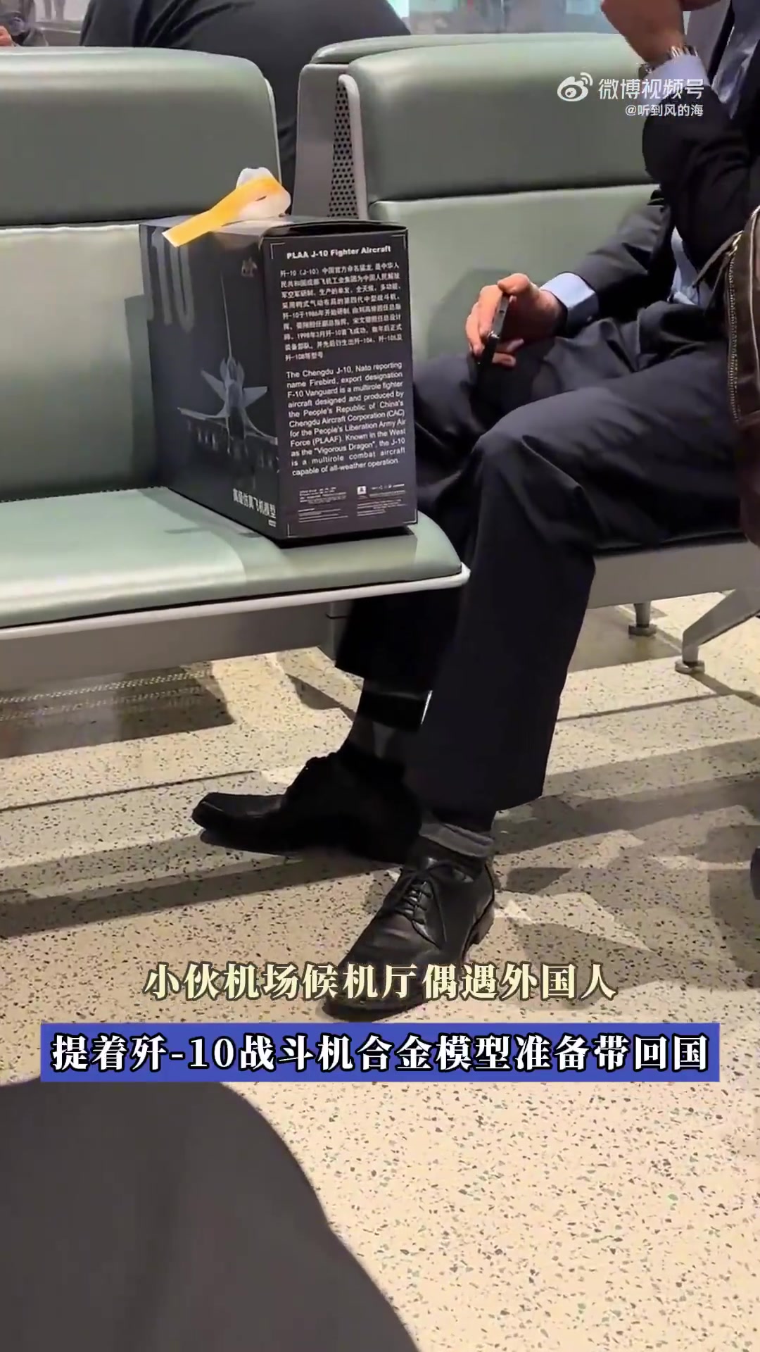 小伙机场候机厅偶遇外国人,提着歼-10战斗机合金模型准备带回国