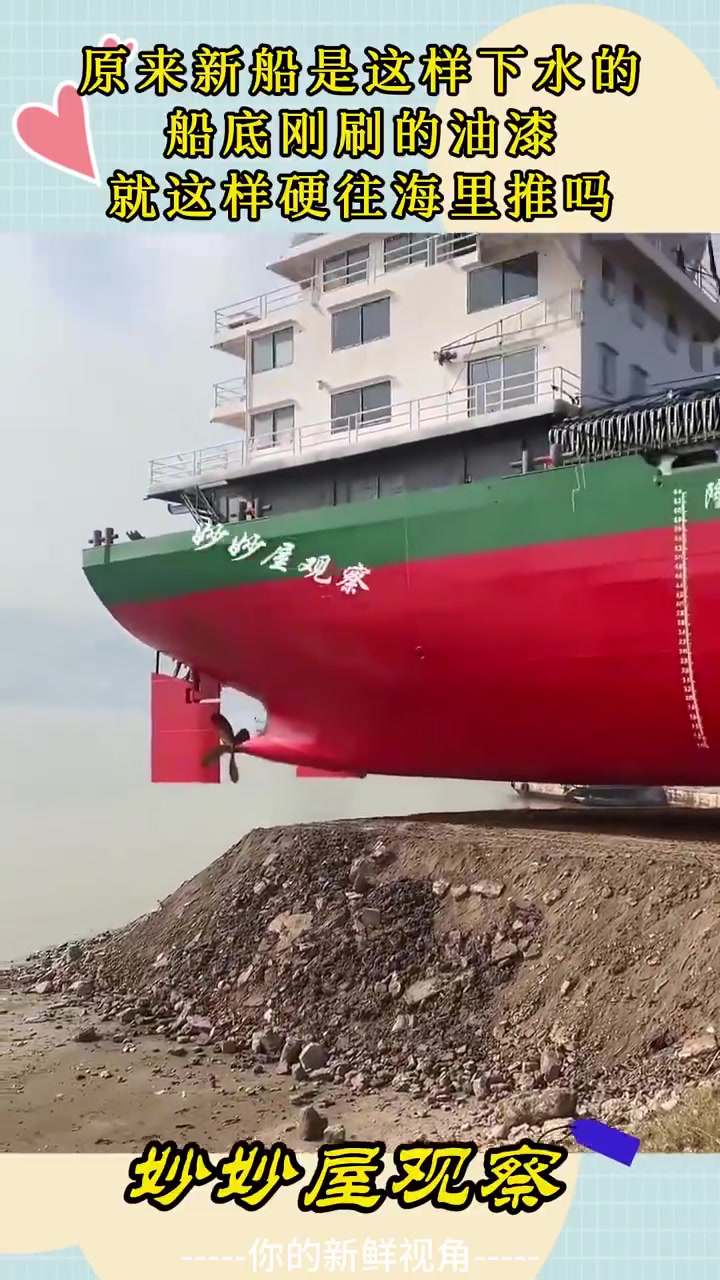 >原来新船是这样下水的,船底刚刷的油漆,就这样硬往海里推吗